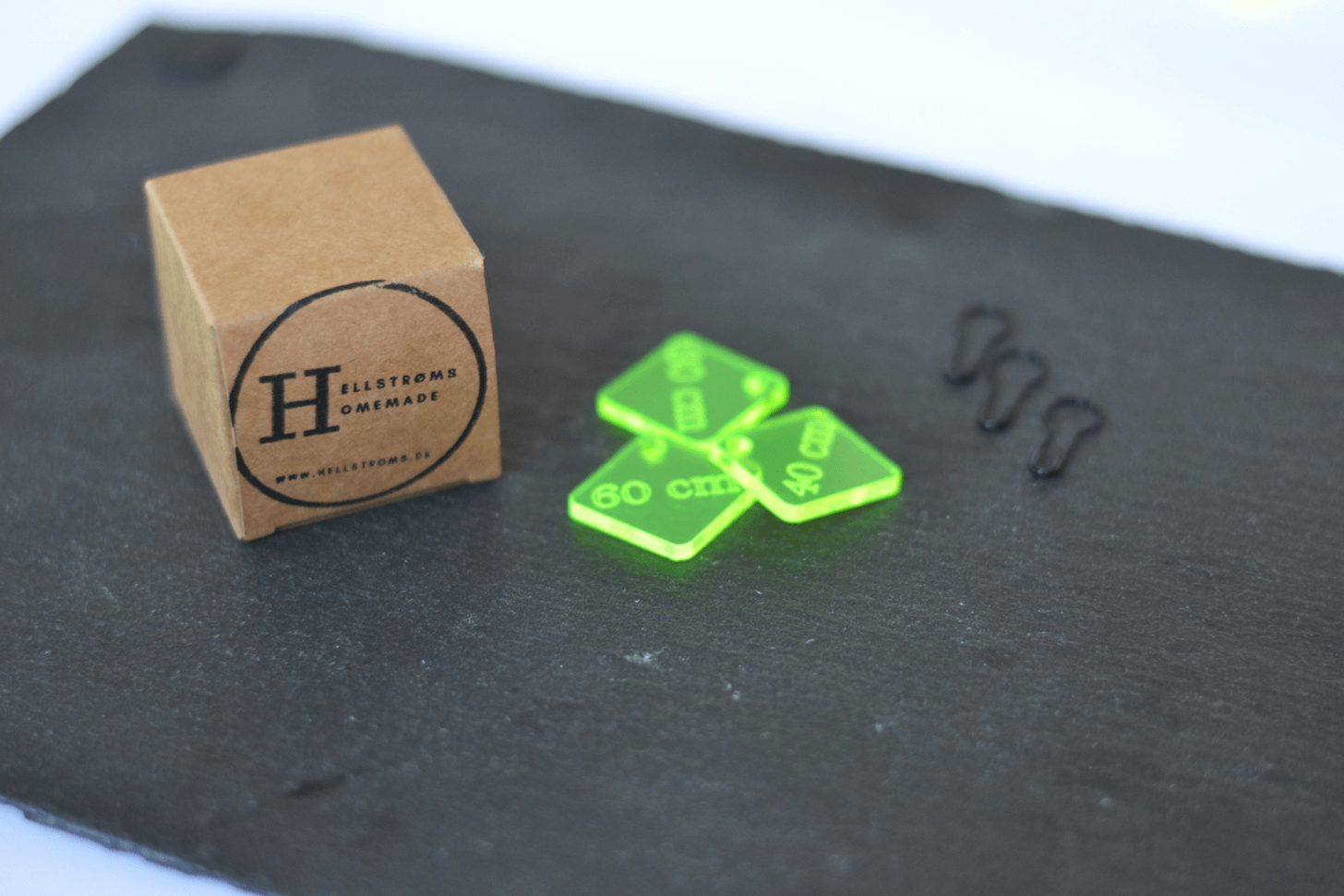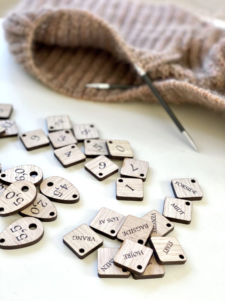 Sættet kommer med tilhørende sikkerhedsnåle og indeholder 3 strikkebrikker med målene: